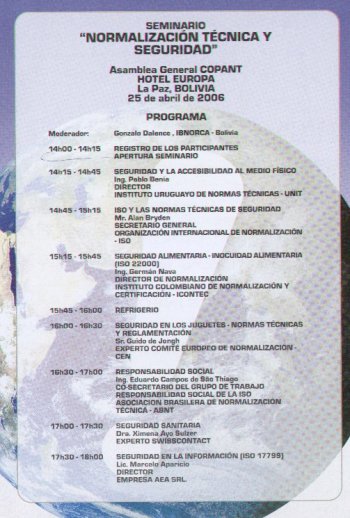 Durante la Asamblea Anual de la Comisión Panamericana de Normas Técnicas (COPANT) realizada en La Paz, Bolivia, del 24 al 28 de abril de 2006, tuvo lugar el Seminario “Normalización Técnica y Seguridad”.