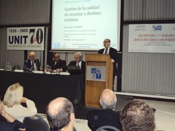Tuvo lugar en la Sede de UNIT, con la Presencia del Sr. Ministro de Turismo y Deporte la conferencia: GESTIÓN DE LA CALIDAD EN SERVICIOS Y DESTINOS TURÍSTICOS, la cual estuvo a cargo del Ing. Francisco Verdera Marí, Director de Relaciones Internacionales y Cooperación de la Asociación Española de Normalización y Certificación (AENOR).